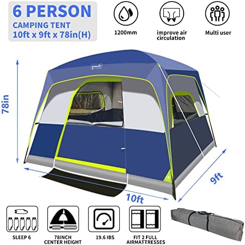 6-Person Tent/Instant for Camping Windproof Family 60 Seconds/Easy Setup Cabin Tent with Top Rainfly, Double Layer,4 Large Mesh Windows,2 Mesh Door,Provide 2 pcs Gate Mat Camping Tent-10’X9’X78”(H)