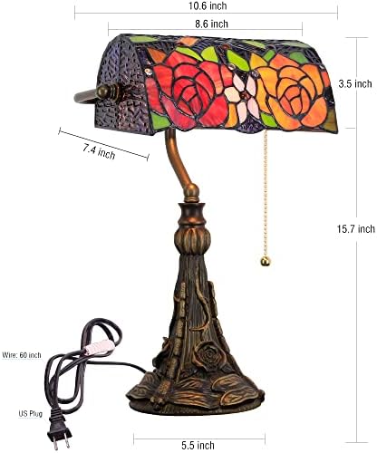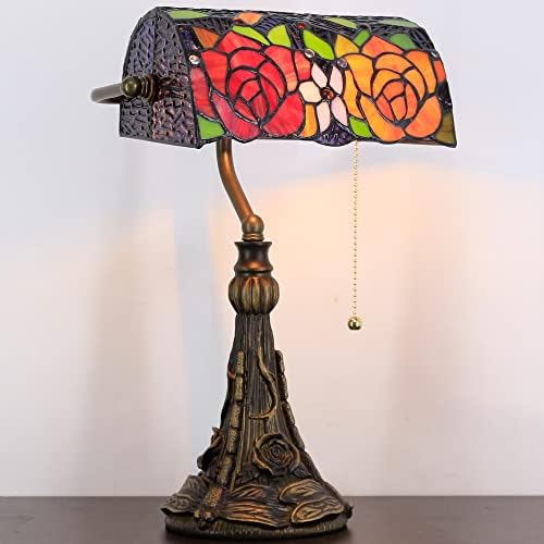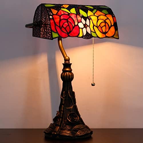 RHLAMPS Banker Lamp Tiffany Desk Lamp Red Yellow Rose Style Stained Glass Table Lamp, 15″ Tall Memory Adjustable Piano Lamp, Luxury Bedside Night Light for Living Room Bedroom